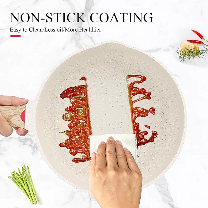 - High Quality Skillet Pan - Our sauce pan with Aluminum Die Casting process, well made quality,heavy duty, PFOA/PTFE free and non toxic. With thoughtful design of two pour sprout can bring convenience for your either hand. The bakelite handle features wood grain design, it is comfortable to grip and stays cool while cooking.