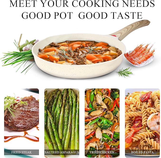 - Induction Bottom - The nonstick skillet bottom is flat and thick, which helps distribute heat evenly and quickly. The induction bottom of the skillet is suitable for all types of cooking,including electric and ceramic cook tops Gas stove,glass top and induction compatible. Recommended for daily use,indoor,outdoor as well as camping.