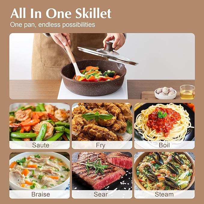 - Suitable for All Stoves – The high-magnetic-conductivity stainless steel base ensures compatibility with all cooktops, including induction. The frying pan features a sturdy die-cast aluminum core for fast, even heating.