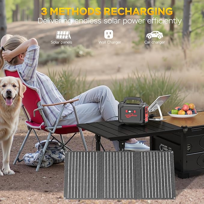 - MULTIPLE RECHARGING OPTIONS: The emergency battery supply can be recharged in three ways. It takes approximately 7-8 hours to fully recharge via an AC 110V wall socket. It can also be recharged under direct sunlight using the solar panel (DC 16.6-25V/1.5A Max, Solar MC4 Connectors included), or with the car lighter outlet