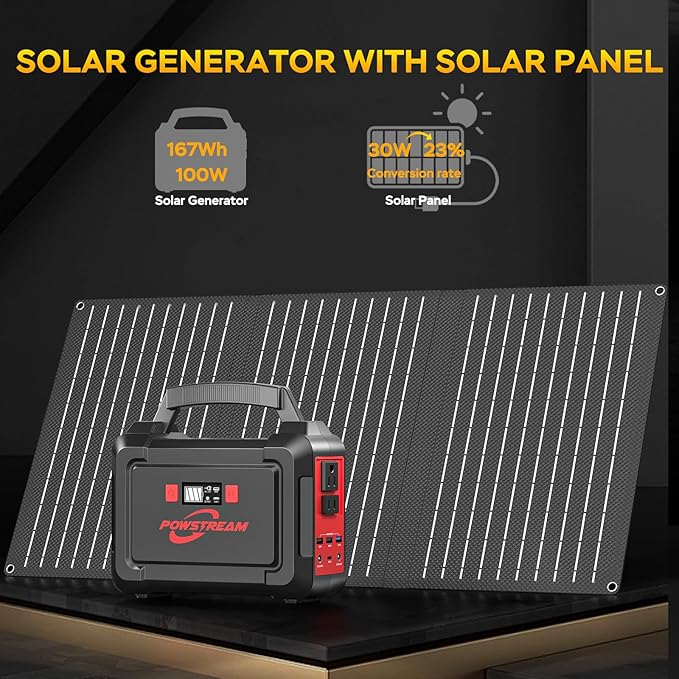 POWSTREAM Solar Powered Generator 167Wh Portable Power Station with Solar Panel 30W Included, 100W Power Bank with AC Outlet QC3.0 for Camping Boat Trip Hunting Outdoor Adventures Emergency Backup