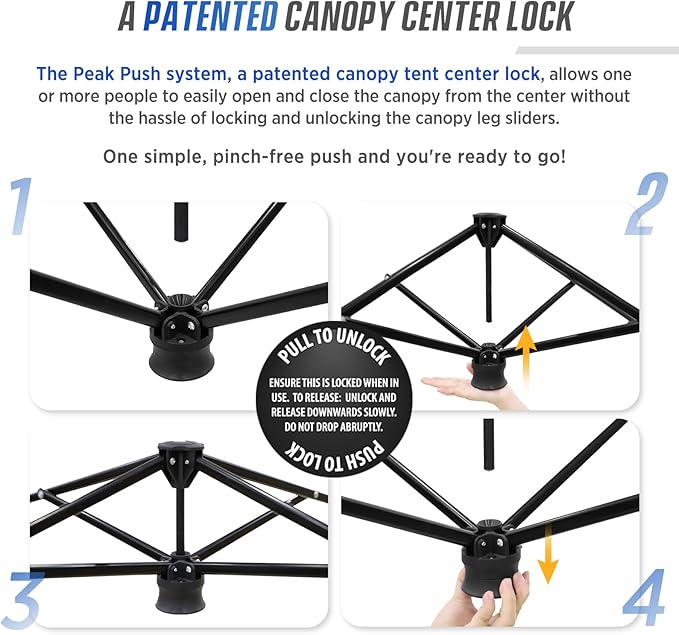 - EASY SETUP: This easy setup pop up canopy tent features the Peak Push system, a patented canopy center lock. The portable canopy requires no tools and easily opens and closes from the center in seconds. Its unique canopy tent center lock enables a quick, one person setup, letting you maximize outdoor time with minimal effort
