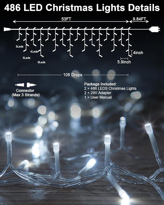 - Christmas Lights Outdoor Structure: Enhance your outdoor Christmas decorations with these lights. 2Packs 53FT 486 LED arranged 108 cascading drops, in a beautiful rhythm of 3-5-4-6, creating a dynamic visual effect (Total 106 Feet 972 LEDs). With an extra 9.84 FT lead wire, connecting to the power supply is easy. Whether it's Christmas or any other festival, these outdoor Christmas lights for house will bring warm brilliance and a joyful atmosphere to you