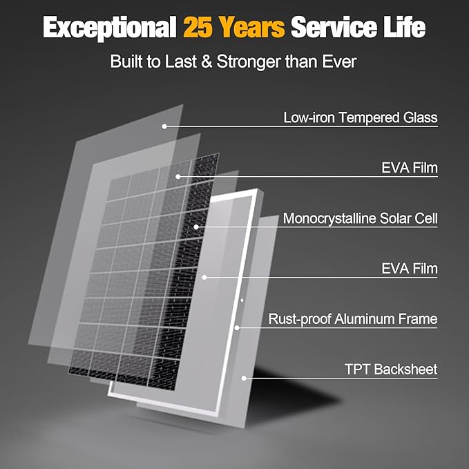 - 【Durable Design】Featuring a low-iron tempered glass surface and a corrosion-resistant aluminum frame, this solar panel is completely waterproof and rustproof, offering an impressive lifespan of up to 25 years. This 12V solar panel is engineered to endure harsh weather conditions, including sandstorms, high winds, thunderstorms, blizzards, and hail. It can handle wind pressures up to 2400Pa and snow loads of up to 5400Pa.
