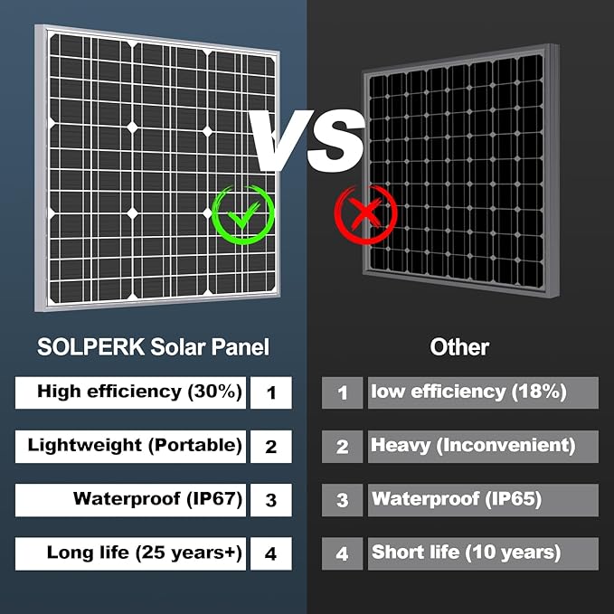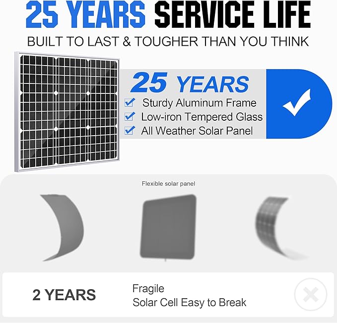 - 【Advanced monocrystalline silicon】 The 50 watt solar panel uses A+monocrystalline silicon, monocrystalline A+ solar cell has an excellent cell efficiency of 30%. Solar Charger Kit designed to charge and maintain 12V rechargeable batteries, including LiFePO, with a lifespan of up to 25 years, Lithium Ion, AGM, SLA, GEL, EF.