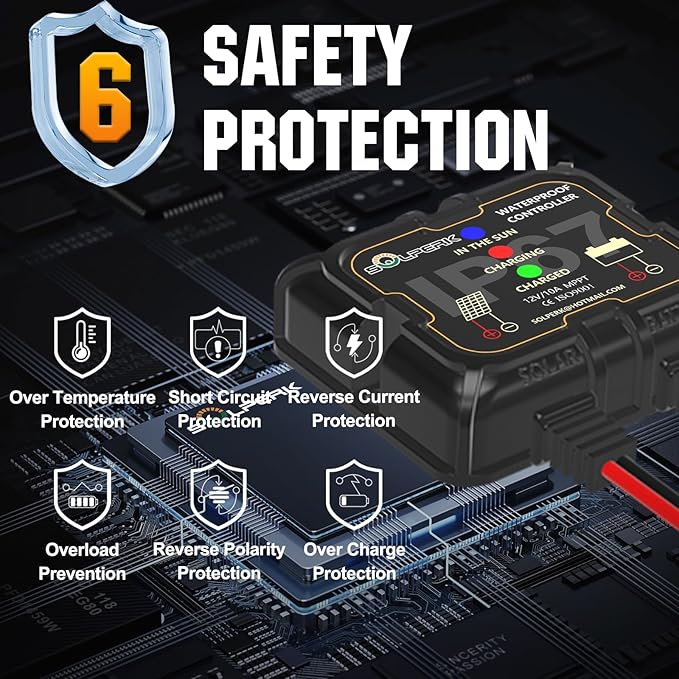 - 【High-Efficiency MPPT Controller】This advanced MPPT charge controller providing over 30% additional power compared to standard solar charge controllers. This fully waterproof MPPT controller can be completely submerged in water. It offers comprehensive protection for your battery, safeguarding against overcharging, deep discharging, excessive voltage, current surges, overloads, short circuits, reverse polarity, and overheating.