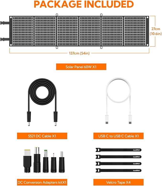 - What You Get - LUM SOLAR 60W Foldable Solar Panel x1, USB-C to USB-C Cable x1, DC 5521 to 5521 Cable x1, 5 DC Adapters x1, User Manual x1,and lifetime customer support.