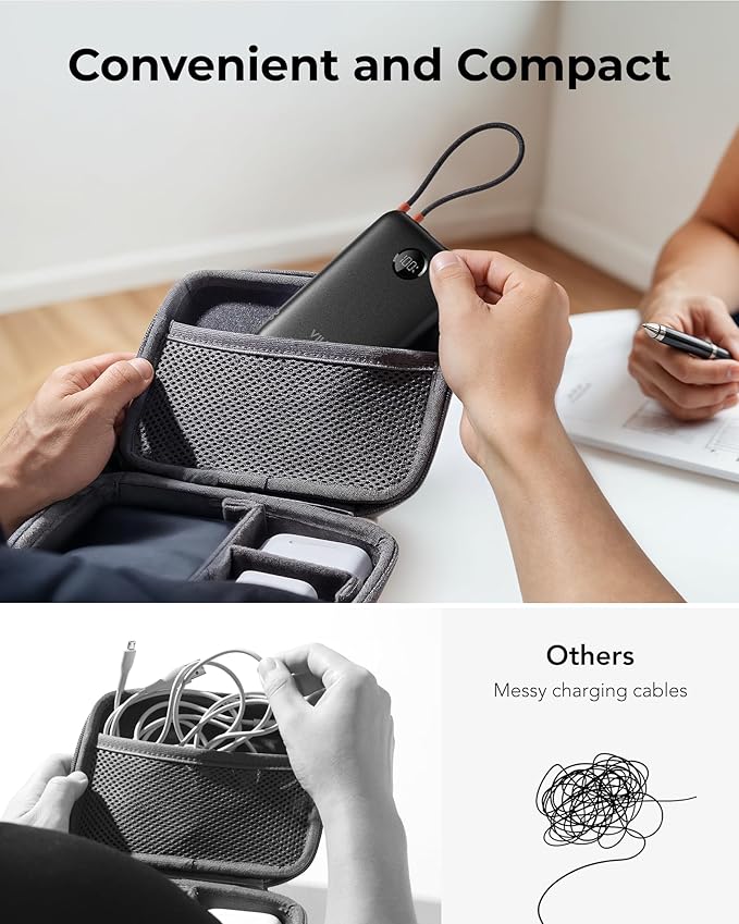- Built-In USB-C Cable: Designed specifically for USB-C devices, this small power bank perfectly compatible with iPhone 16/15 series, Samsung Galaxy, Google Pixel and other Type-C devices, always ready without a separate cable!