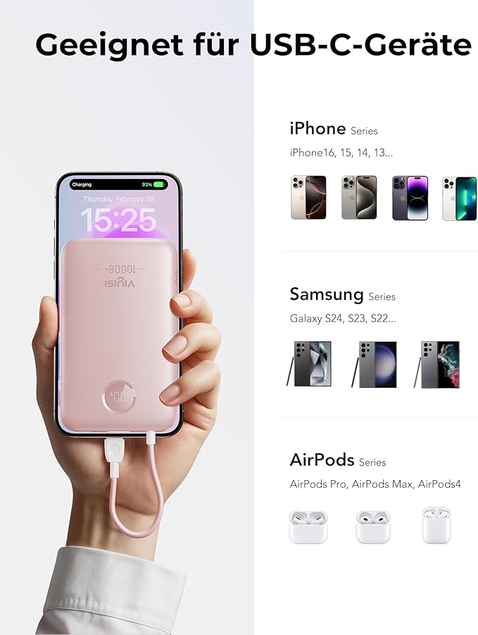 - Built-In USB-C Cable: Designed specifically for USB-C devices, this small power bank perfectly compatible with iPhone 16/15 series, Samsung Galaxy, Google Pixel and other Type-C devices, always ready without a separate cable!