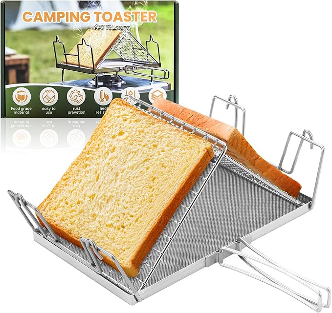 - Easy to Operate: Stainless steel camping toaster has a fine steel mesh for even heat distribution ,heat easier and faster effects on the bread,and easy operation. The camp toaster stove top can produce excellent results on any type of gas stove, that will give you years of quick and easy backcountry breakfasts.