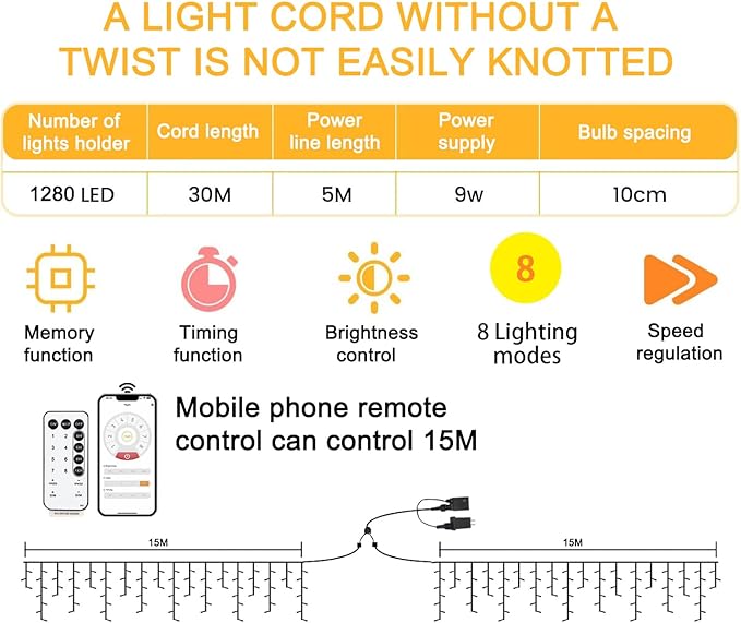 - LED Christmas Decoration Lights : Featuring a total of 1280 LEDs, these outdoor Christmas decoration lights are the perfect choice for those seeking festive garland lights. The 5-meter extension cable accompanying the outdoor string lights ensures durability and resistance to overheating.