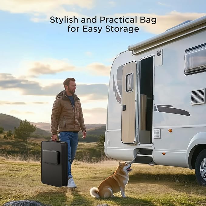 - 【Foldable and Easy Setup】Our solar panel 200w is compact and foldable, with folded dimensions of 27*17.9*3.54 inches and a weight of 20.6 lbs. This 200w solar panel includes a stylish carrying bag for easy storage in your camper or RV without taking up much space. For easy setup, simply unfold the panel and adjust the 4 kickstands to about a 90-degree angle to the sun for optimal power output. Perfect for convenient, space-saving energy on the go