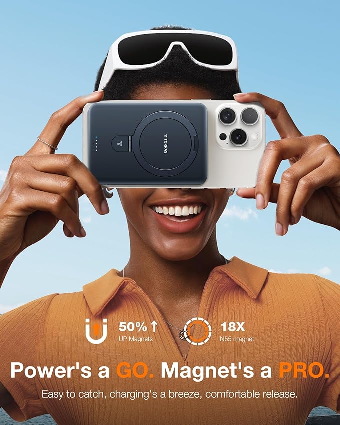 TORRAS 0.45" Slim Magnetic Portable Charger Power Bank for iPhone 5000 mAh 22.5W PD Fast Charging Wireless Battery Pack O Stand Compatible with Magsafe, i Phone 16 Pro Max, Pro,15,14,13,12, Black