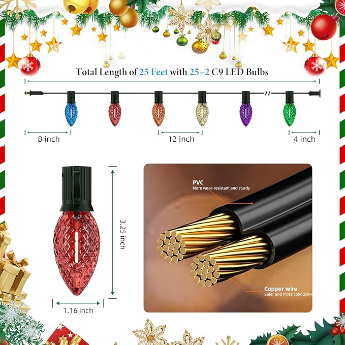 - Easy to Use: This 25-foot long C9 Christmas lights is compatible with C9/E17 bases and comes with 25 colorful bulbs. Two spare bulbs are included for replacement. Each bulb has a power rating of 1 watt, making the total power consumption of the string 25 watts, suitable for 120V power supply. Both the C9 bulbs and filaments are easily detachable or replaceable, making operation simple and allowing you to effortlessly enjoy the festive ambiance created by the christmas string lights for outside.