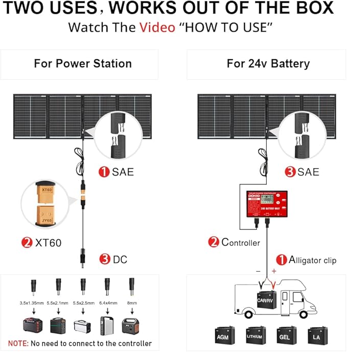 - 【PERFECT CHOICE FOR OUTDOOR AND EMERGENCY LIFE】-- 9.85ft (3m) cable length from panel to controller, For most power stations (Jackery,Goal Zero,Ecoflow,Paxcess) and 24-volt batteries(AGM,LiFePo4,Deep cycle batteries),RV,car,boat,trailer,truck,pumpa,camping,van,emergency power.