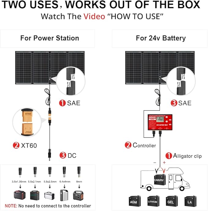 - 【PERFECT CHOICE FOR OUTDOOR AND EMERGENCY LIFE】-- 9.85ft (3m) cable length from panel to controller, For most power stations (Jackery,Goal Zero,Ecoflow,Paxcess) and 24-volt batteries(AGM,LiFePo4,Deep cycle batteries),RV,car,boat,trailer,truck,pumpa,camping,van,emergency power.