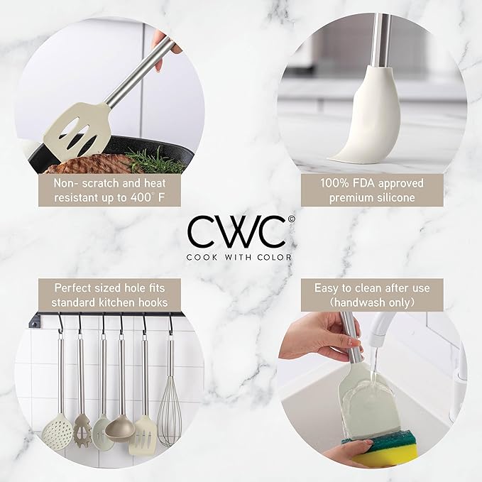 - Make the smart choice with a long lasting set that is constructed from premium food grade silicone to protect your nonstick cookware from scratches and scrapes. Silicone allows for less buildup and mess so these tools will be super easy to clean. Top rack dishwasher safe. Resistant to odors and stains.