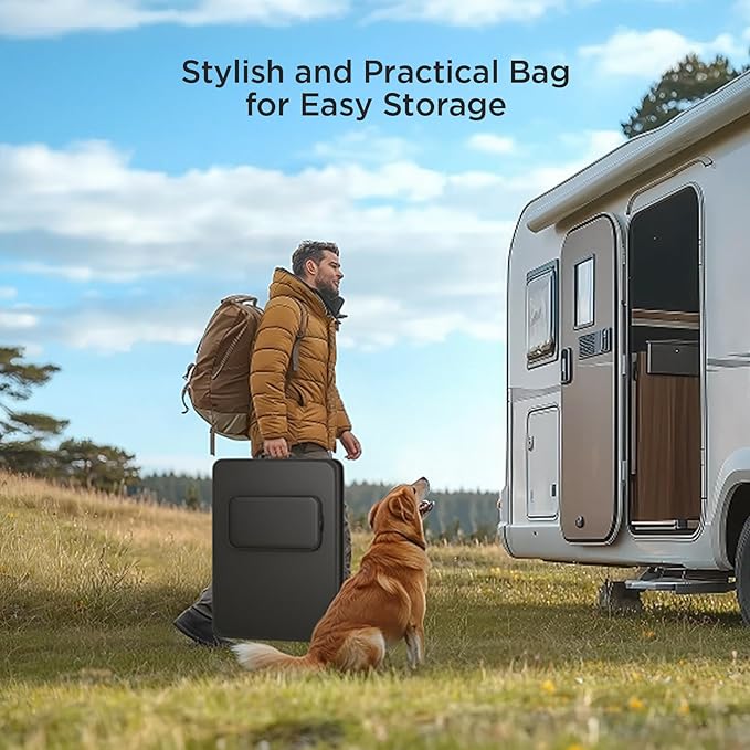 - 【Portable,Foldable and Easy Setup】Our 100w solar panel portable is designed to be portable and foldable, with folded dimensions of 27 x 17.9 x 1.77 inches and weighing only 9.36 lbs. It includes a stylish carrying bag, making it easy to store in your camper or RV without occupying much space. For a quick setup, just unfold the folding solar panel and position the 2 kickstands at approximately a 90-degree angle toward the sun for maximum power output