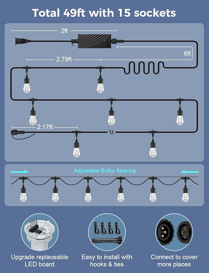 - Shatterproof and IP65 Waterproof: LED bulbs are made from durable plastic, resistant to accidental drops and bumps. This outdoor string lights waterproof ensures both lights and adapter fit for outdoor use, and last with a 30,000-hour lifespan