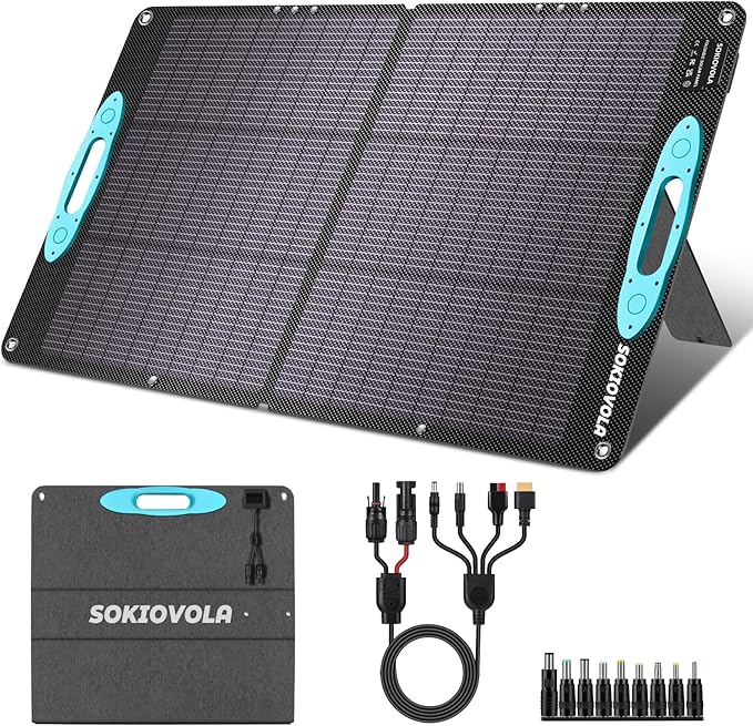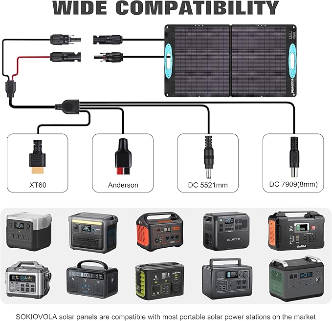 - 【Compatible with Most Solar Generators】SOKIOVOLA 100W Portable Solar Panel comes with MC-4 to 4-in-1 solar panel connectors (XT60,DC5521, DC7909 (8mm),Anderson),compatible with most solar generators/portable power stations on the market. Compatible with most solar generators/portable power stations on the market (e.g. Jackery,Ecoflow,Blutti,FlashFish,Goal Zero,Anker, etc.)