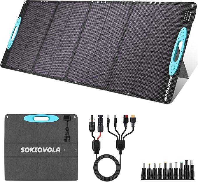 - 【Compatible with Most Solar Generators】SOKIOVOLA 160W Portable Solar Panel comes with MC-4 to 4-in-1 solar panel connectors (XT60,DC5521,DC7909 (8mm), Anderson),compatible with most solar generators/portable power stations on the market. Compatible with most solar generators/portable power stations on the market (e.g. Jackery, Ecoflow,Blutti,FlashFish,Goal Zero,Anker,etc.)