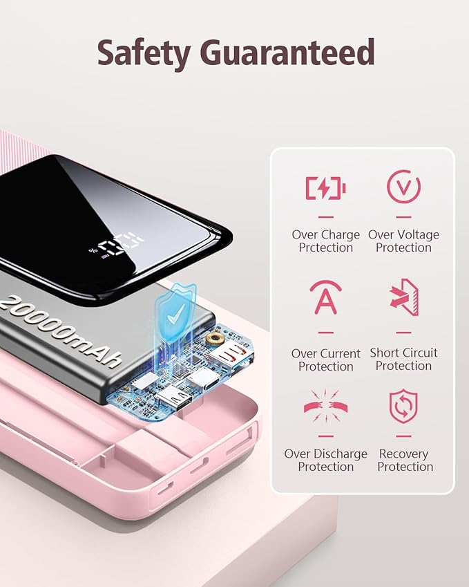 Portable Charger Power Bank - 20000mAh Fast Charging Portable Battery Pack with Built in USB-C(22.5W) and iOS(20W) Output Cables (1 Pack, Pink)