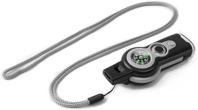 - The 7-in-1 Safety Whistle sets 8 functions including Emergency Whistle, Compass, Thermometer, LED Signal Light, Magnifying Glass, Reflector and Sealed Warehouse with good playability (The uniquely designed miniature built-in storage bin can be used to store important personal information, allowing rescuers to grasp your situation at the first time) (NOTE: If you need help in an emergency, you can try whistling softly, which is louder than whistling at full force)