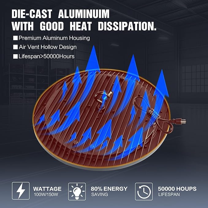 - Durable and Long-lasting: Equipped with die-cast aluminum housing and excellent heat dissipation, this UFO Led High Bay Light ensures durability and longevity with a lifespan of over 50,000 hours. The light can operate under a current of AC100-277V.