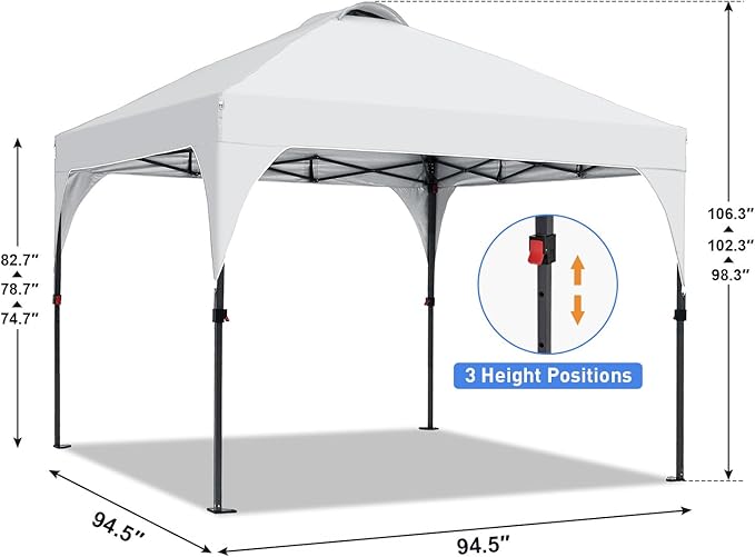 - 【3 Adjustable Heights】There are three holes for height adjustment on each leg of the tent. You can freely change the height of the canopy by pressing pinch-free buttons. ( Each tent comes with ground stakes and ropes to help hold down your canopy stably on a pretty windy day.)