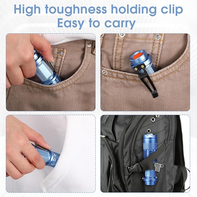 - Portable and Compact: zoomable pocket led flashlight is about 3.58 x 0.98 inches, the mini size makes it easy to put into your pocket, backpack or purse, featuring with clips, mini flashlights can clip to your binder, shirt, backpack, belt or pants pocket