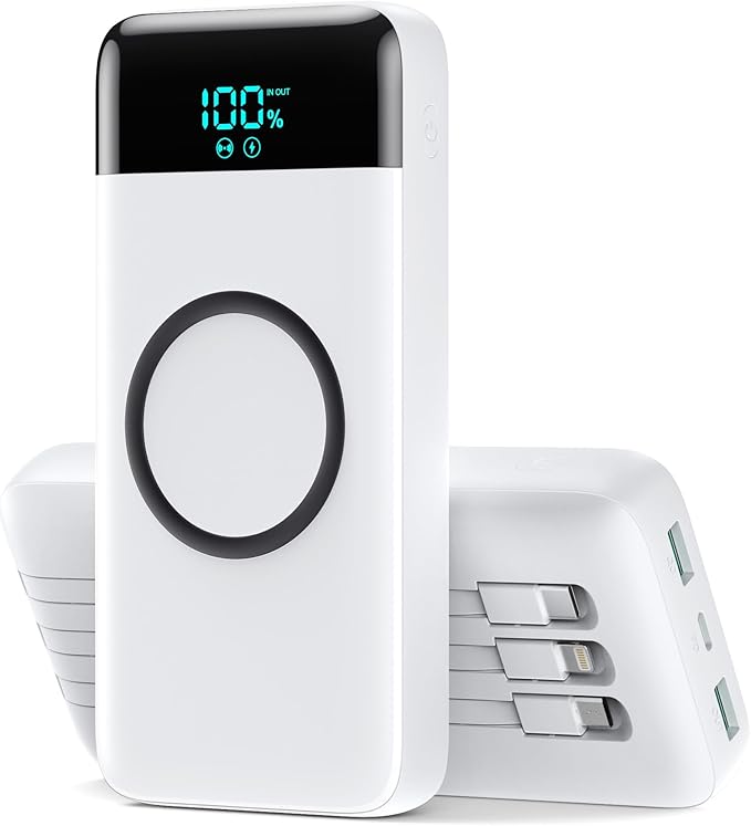 - 【Widely Compatibility Power Bank with Built-in Cables】Equipped with 3 built-in output cables( ios, usb-c, micro usb), 3 charging outports ( 2 USB-A, 1 USB-C) and 1 wireless charging output, compatible with almost all types smart devices on market such as iPhone 16/15/13/12/11 Series, XR/XS Max, Samsung S25/S24/S23/S22 /S21/S20/A52/A32/Z fold series ,Z flip series and google pixel series and other android phones ,tablets etc... ( Please note: This power bank is wireless charging power bank, Not magnetic ! ).