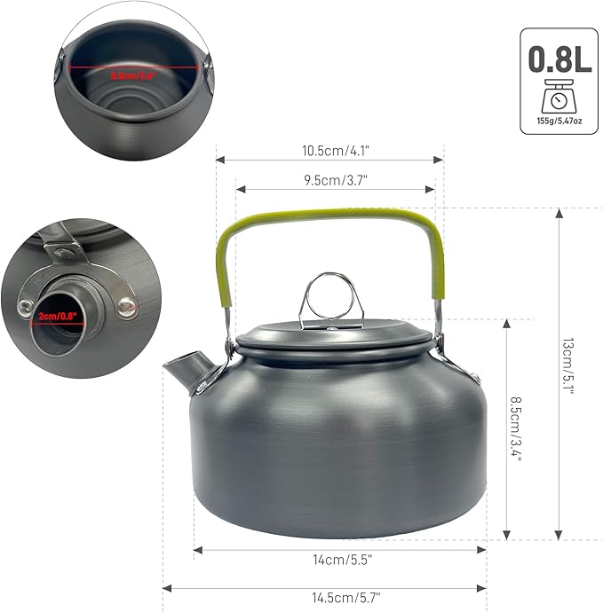- Portable and Lightweight: Only around 0.3 lb, Capacity: 0.8L. Comes with a mesh bag, for easy storage and carrying. Can be used as a camping teapot or coffee pot, for boiling water, tea, coffee, hot drinks and soup. Suitable for indoor and outdoor use, especially for hiking, backpacking, camping, traveling, fishing and picnic.
