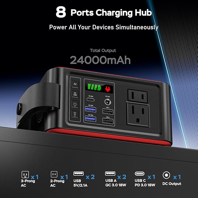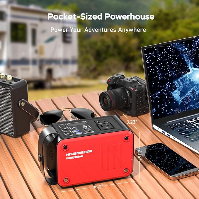 - 88.8Wh CAPACITY BATTERY: Equipped with a reliable 88.8Wh (24000mAh) battery, this power station can charge smartphones, tablets, cameras, and other devices multiple times, ensuring you stay connected and powered up wherever you go.