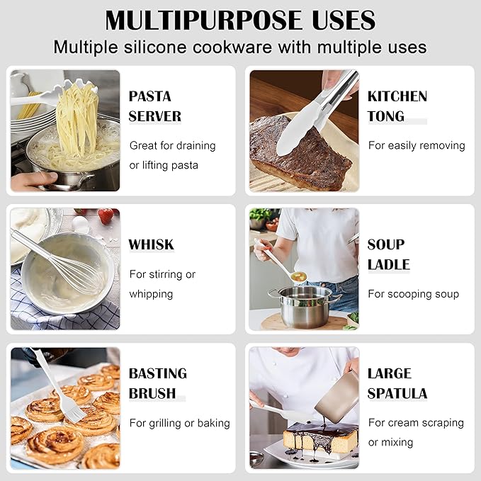 - HEAT-RESISTANCE AND NON-STICK: The silicone cooking utensils set is soft and scratch-resistant, prevents scratches inducing on non-stick cookware surfaces, Also they are heat resistant, not easy to bend, melt, or wrap under high temperature, could meets all you kitchen cooking demands for stirring, scooping up, mixing, baking, cooking, whisking, basting, frying or serving