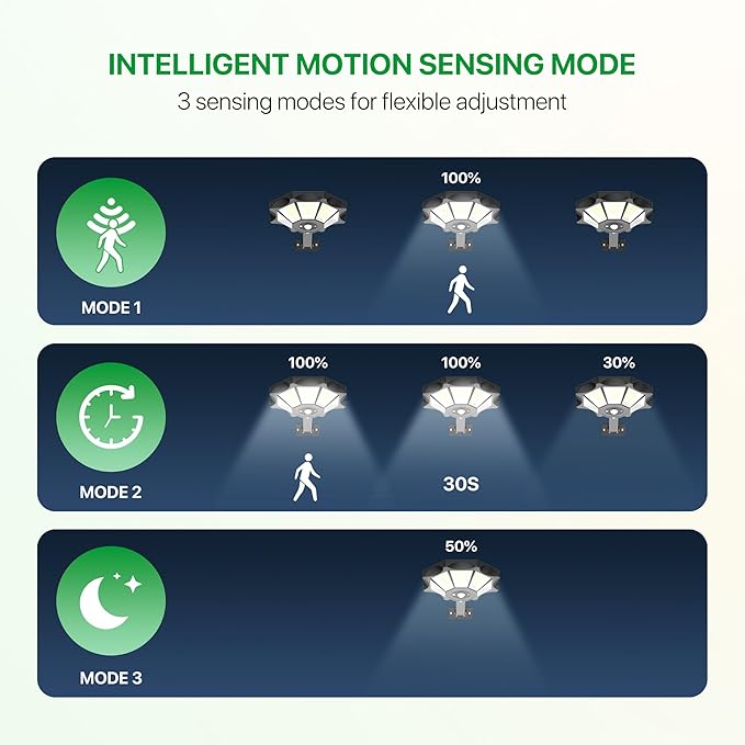 - [INTELLIGENT MOTION SENSOR MODE]: The solar street lights outdoor offers automatic on/off functionality, lighting up at dusk and turning off at dawn. With a built-in high-precision motion sensor, it supports three smart lighting modes to suit different needs: 1) Motion sensing mode: 100% brightness when motion is detected, 20% brightness when no motion is detected. 2) Movement sensing mode: 100% brightness when motion is detected, lights off when no movement. 3) Timed mode: The light automatically turns on at 50% brightness during the night. This hands-free operation saves energy while enhancing security