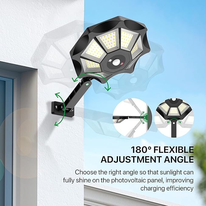 - [TOOL-FREE INSTALLATION] No electrician needed for these solar flood lights outdoor. Adjustable 180° bracket allows optimal solar panel positioning on walls/poles between 6.5-13ft height. Ideal solar led lights for outside placement: garages/pathways/pool areas