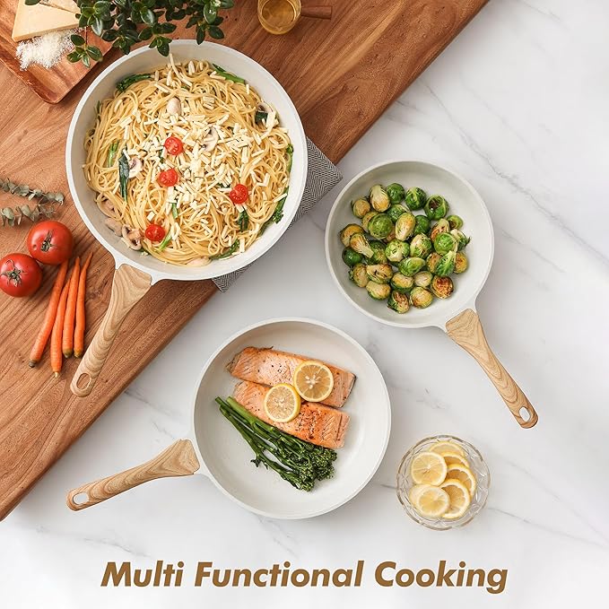 - Super Nonstick & Easy to Clean - Adding a drizzle of oil and the food slide smooth. The nonstick chef pan set makes cooking easier and your food is much more flavorable with less oil! Ceramic non-stick coating makes cleaning a breeze. Wipe with a towel or rinse with water and the skillets get clean.