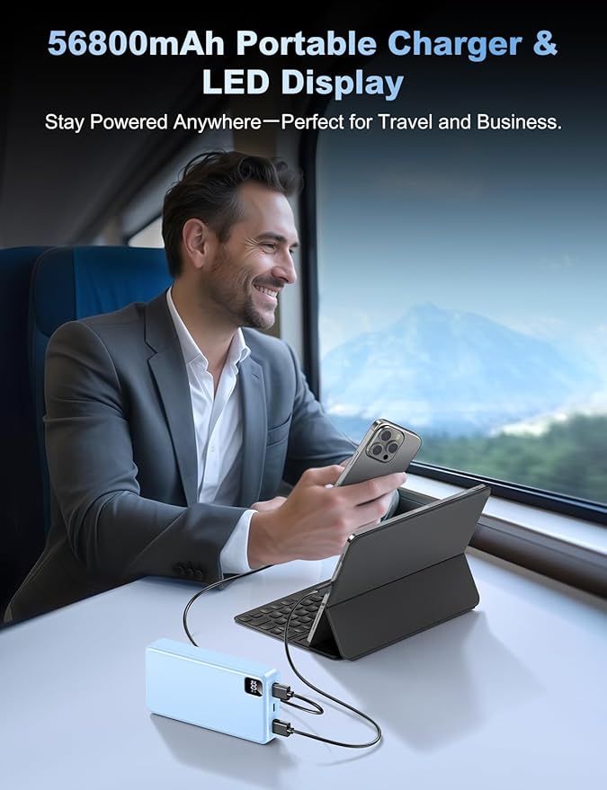 - Massive 56800mAh Capacity – Power That Goes the Distance: Designed for power-hungry users, this 56800mAh portable charger delivers days of reliable energy for iPhone 16/15/14/13 Pro Max/Pro/Plus or Sumsang, Google Pixel. Charge your phone up to 11 times or your tablet multiple times—ideal for long trips, camping, or business travel. Say goodbye to low battery anxiety and enjoy the freedom of staying connected, wherever your journey takes you.