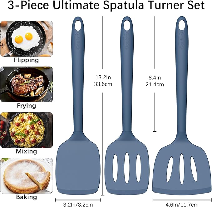 - [Versatile Spatula Set of 3]: This cooking utensils set includes a Large Fish Spatula, Slotted Spatula, and Solid Spatula—ideal for flipping eggs, pancakes, burgers, and frying fish without scratching your kitchenware