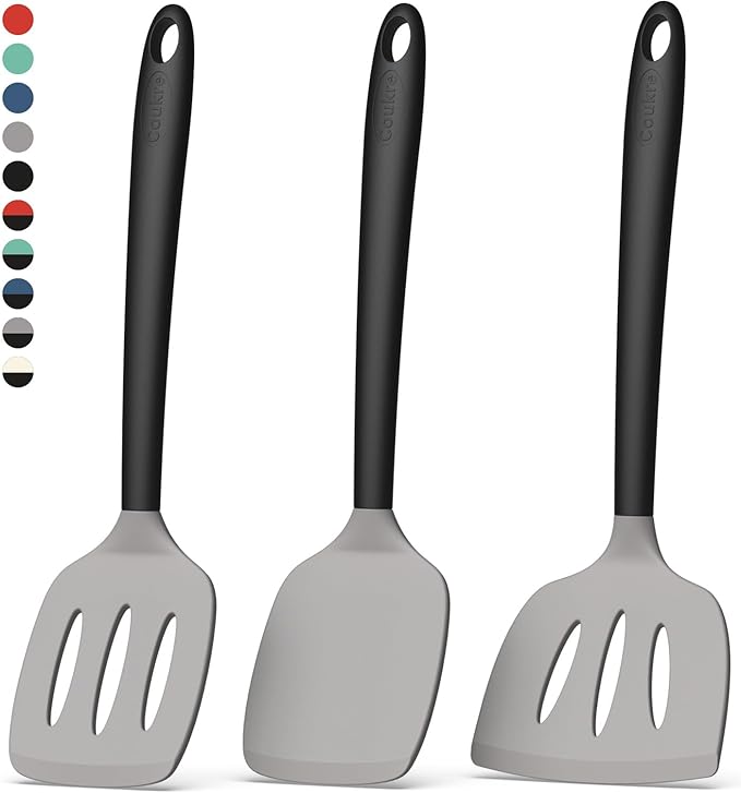 Coukre Silicone Spatula Set of 3, High Heat Resistant, BPA-Free, Kitchen Utensils, Fish Spatula, Solid & Slotted Turner for Non-Stick Pans, Flipping Eggs, Pancakes, Fish, Burgers (3, Gray)