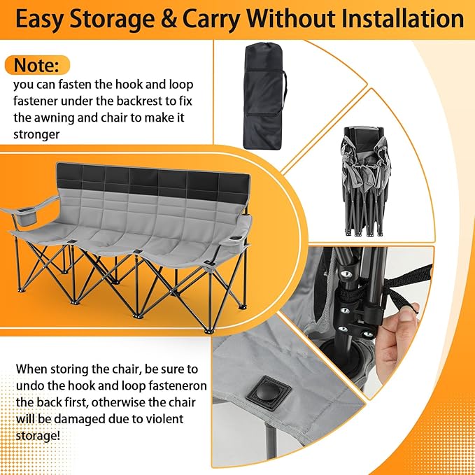 - Portable and Easy to Carry: the 3-person folding chair quickly folds and comes with a carry bag for easy storage and transportation; Lightweight and portable, it's ideal for camping, beach trips, fishing, or garden parties; Your ultimate companion for outdoor adventures