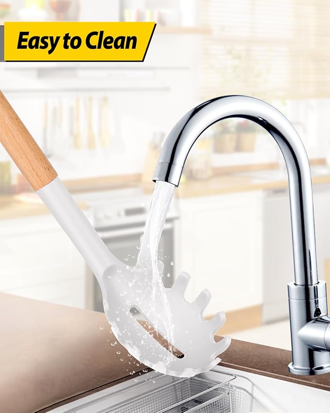 Silicone Pasta Fork and Ladle Spoon Set with Wooden Handle, Heat Resistant Non Stick Kitchen Utensils for Cooking, Stirring, Serving Spaghetti, Soup, Sauce(WHITE)