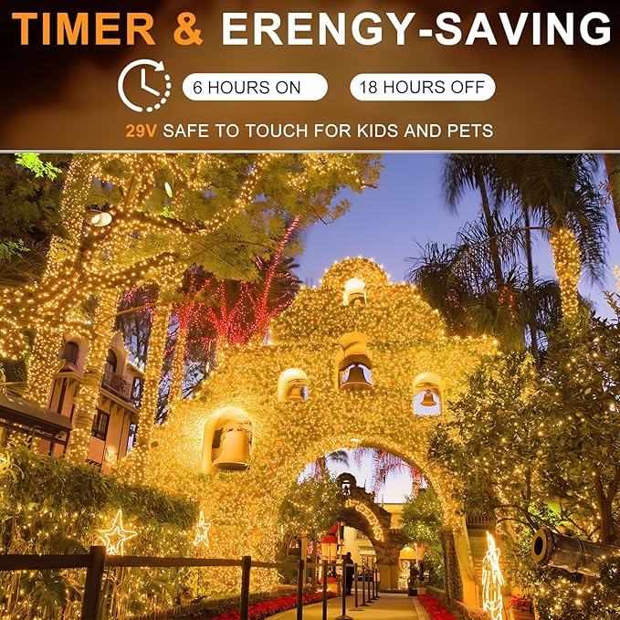- Smart Timer & Memory — Let Your Lights Remember Your Life: With an integrated timer and memory chip, forget about turning the LED Christmas Lights ON or OFF manually. Decorative Lights automatically glow at 5 PM, welcoming you home after a long day, and turn off at 11 PM to save energy. For special occasions or extended celebrations, pre-set "Party Mode" (7 PM–3 AM) or "Holiday Mode" ensures your festive spirit never fades.