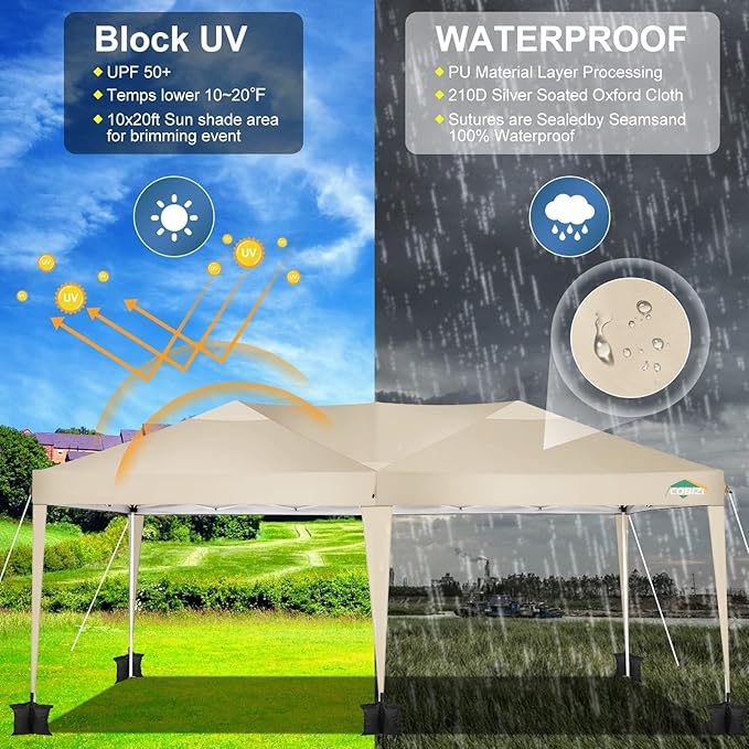 COBIZI Canopy 10x20 Pop Up Canopy Tent 10x20ft Waterproof Easy Up Tents for Parties Wedding Outdoor Commercial Event Gazebo Portable Instant Tent for Backyard Camping Car Port(Khaki