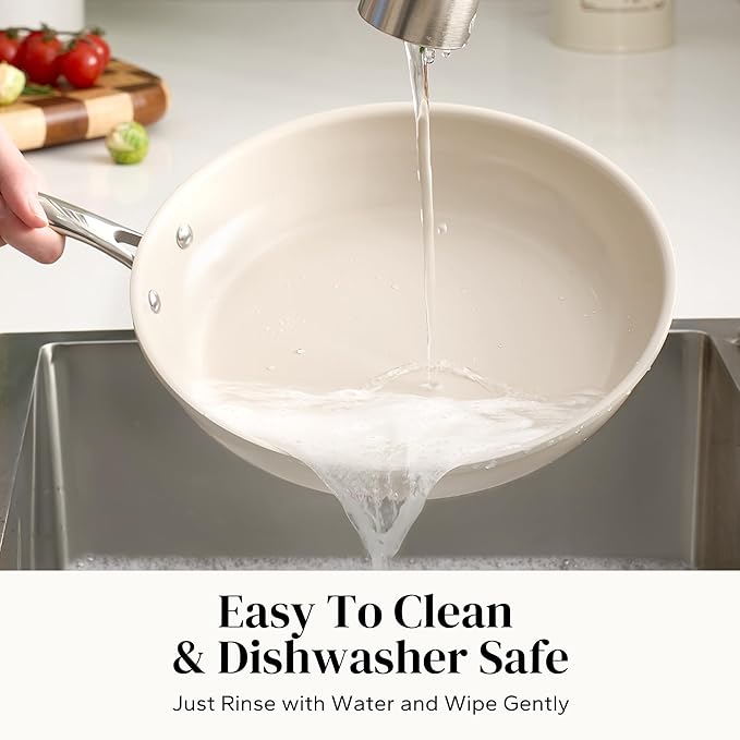 - COOL & STURDY HANDLE: Crafted from lightweight, precision-pressed stainless steel, this ergonomically designed handle ensures a comfortable grip. Double-riveted for exceptional strength and maneuverability, the ceramic skillet pan empowers you to seamlessly transition from stovetop to oven, allowing you to achieve that flawless sear, brown toppings, or even bake