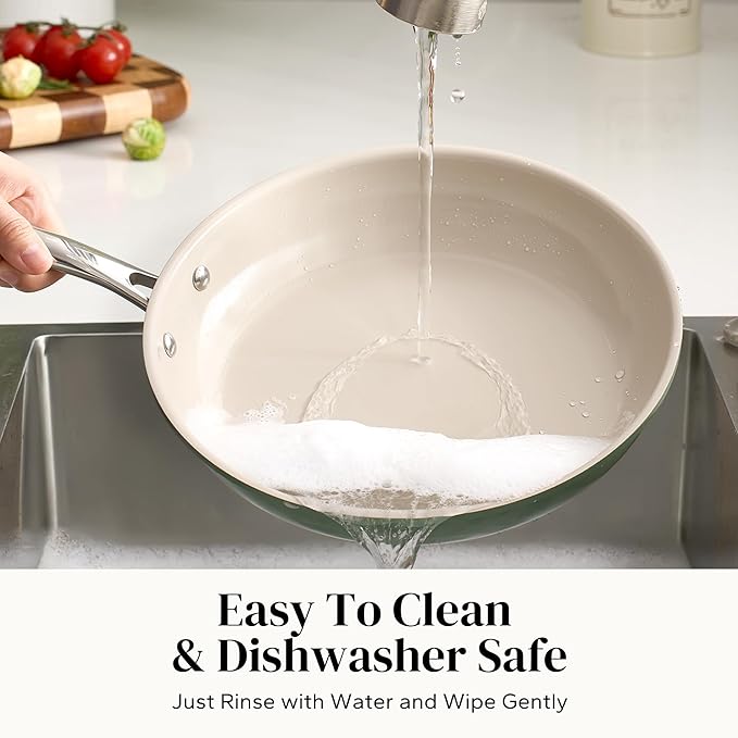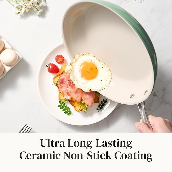 - COOL & STURDY HANDLE: Crafted from lightweight, precision-pressed stainless steel, this ergonomically designed handle ensures a comfortable grip. Double-riveted for exceptional strength and maneuverability, the ceramic skillet pan empowers you to seamlessly transition from stovetop to oven, allowing you to achieve that flawless sear, brown toppings, or even bake