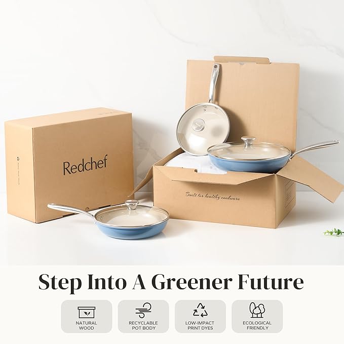 Redchef Nonstick Cookware Sets, Ceramic Frying Pan Set with Tempered Glass Lids, Non Stick Cooking Set, Dishwasher & Oven Safe, Induction Safe, Compatible with All Cooktops, Blue (8", 9.5", 11")