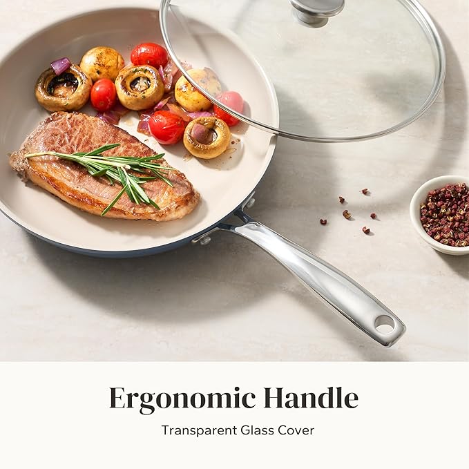 - COOL & STURDY HANDLE: Crafted from lightweight, precision-pressed stainless steel, this ergonomically designed handle ensures a comfortable grip. Double-riveted for exceptional strength and maneuverability, the ceramic skillet pan empowers you to seamlessly transition from stovetop to oven, allowing you to achieve that flawless sear, brown toppings, or even bake