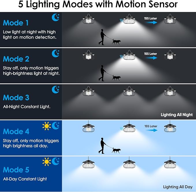- 5 Smart Modes with 2 All-Day Lighting Options – Our solar-powered barn light offers 2 all-day modes perfect for dim indoor spaces: Mode 4 (24/7 motion-activated bright light) & Mode 5 (24/7 continuous illumination). Plus 3 night modes: 2 motion-sensing and 1 steady glow. Customizable lighting for any need!
