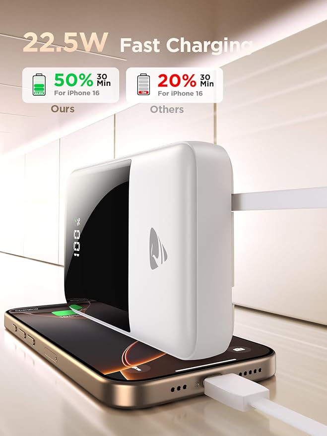 - PORTABLE CHARGER WITH BUILT IN CABLES: This Power bank has 2 built-in cables(iOS and Type C cables) and 2 port(Type A output and Type C input/output Ports), making it compatible with 99% of devices on market such as Samsung S23,S22,S21,S20 Series, iPhone 16/15/15 Plus/15 Pro/15 Pro Max, Tablets, Headphones and etc.. Charging up to 4 devices simultaneously, just grab it and go!